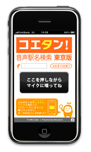 本日、2009年10月6日(火曜日)からトラフィックゲートでアップル社のiPhone向けの「コエタン!音声駅名検索(東京版)」アプリケーションをリリース致しました。「コエタン!」は、Novauris が提供する音声認識検索エンジン「Nova Search」を採用 した乗り換え案内のアプリケーションです。検索したいルートの東京の駅名を「○○か ら○○まで」と iPhone/iPod  Touch に向かって発声すると、アプリケーションがその音声を認識し、iPhone/iPod Touch 上に駅のルート情報(乗り換え案内)や地図情報が表示されます。また、iPhone/iPod Touch にプリインストールされているマップと連動し て、現在地からの徒歩、車、電車のルート情報も表示可能です。