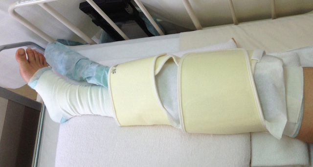 手術は全身麻酔だったので気づいたら終わっていて、起きたら酸素マスク、脚は包帯でぐるぐる、保冷マシーンで脚を冷やされてました。直後は麻酔で意識があまりなかったですが徐徐に麻酔が解けると今度は激痛で意識がモウロウとなりました。とにかく脚を動かさなくても激痛で術後当日は身動きが取れず、2日目は今まで使っていた赤い装具を装着してトイレなどは車椅子で行けるようになりました。しかし、ちょっとでも動くと激痛が走り痛すぎて笑っちゃうほどです。更に体を動かせずベッドに寝たきりなので、腰痛で脚も痛い、腰も痛いでどうしようもならないペアが発生…本日3日目からリハビリトレーニングを初めまして、術前からライズシティクリニックの福島一雅先生のトレーナーに鍛えられていた為、トレーニングメニューを比較的簡単にこなせましたがやはり毎回動かす度に痛みは走ります。
