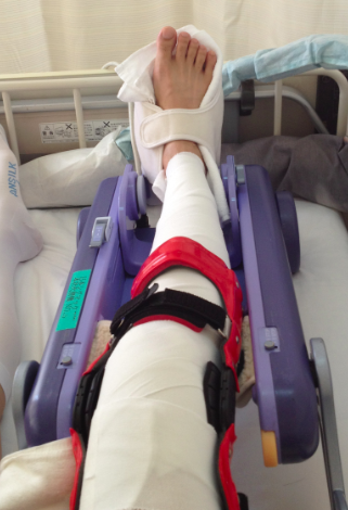 手術は全身麻酔だったので気づいたら終わっていて、起きたら酸素マスク、脚は包帯でぐるぐる、保冷マシーンで脚を冷やされてました。直後は麻酔で意識があまりなかったですが徐徐に麻酔が解けると今度は激痛で意識がモウロウとなりました。とにかく脚を動かさなくても激痛で術後当日は身動きが取れず、2日目は今まで使っていた赤い装具を装着してトイレなどは車椅子で行けるようになりました。しかし、ちょっとでも動くと激痛が走り痛すぎて笑っちゃうほどです。更に体を動かせずベッドに寝たきりなので、腰痛で脚も痛い、腰も痛いでどうしようもならないペアが発生…本日3日目からリハビリトレーニングを初めまして、術前からライズシティクリニックの福島一雅先生のトレーナーに鍛えられていた為、トレーニングメニューを比較的簡単にこなせましたがやはり毎回動かす度に痛みは走ります。