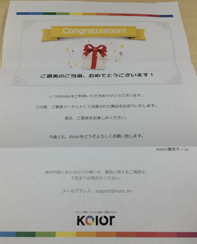 じゃーん!あたった場合は、こちらの画面がでてきて商品発送に関するメールが届き、必要情報を記載して返信します。
