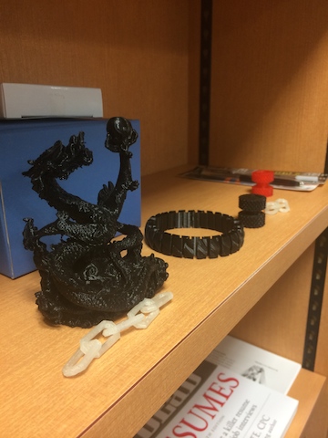 様々な形、伸ばせるブレスレットなど丈夫なプロダクトが色々と作れます。デザインの試作品や日用品など、すぐ印刷できるので優れてます。仮に何かのパーツが壊れても、お店に買いにいかずに印刷する文化が普及したらすごいですね。利用方法に応じて可能性は無限大に感じました。ニュースで最近話題になってますが、実物が動いているのを見た際はワクワクでした。笑