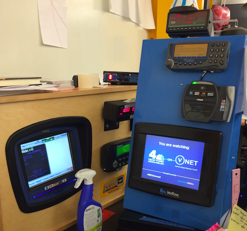 オフィスでタクシーのメーターとアプリが連動できるように多数の機械を装備してテストを行ってます。