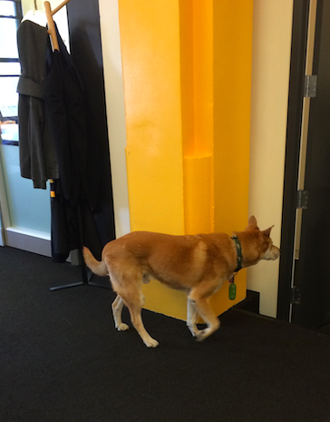 社内を歩いてたら急に犬が現れ驚き!他社の犬だそうですが、たまに遊びに来るとの事。笑