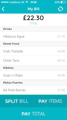 NFCまたはQRコードを読み込むと請求書がアプリに表示、割勘または食べた品だけを選定可能。支払いをボタンを押せばチップも選択可能、登録済みのクレジットカードに請求されます。更に上記の通り、テーブルを担当したウェイターまたはウィエイトレスにメッセージも残す事が可能です。