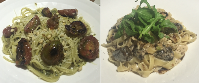 トマトとナッツ入りのバジルソース、マッシュルームのクリームソースパスタ