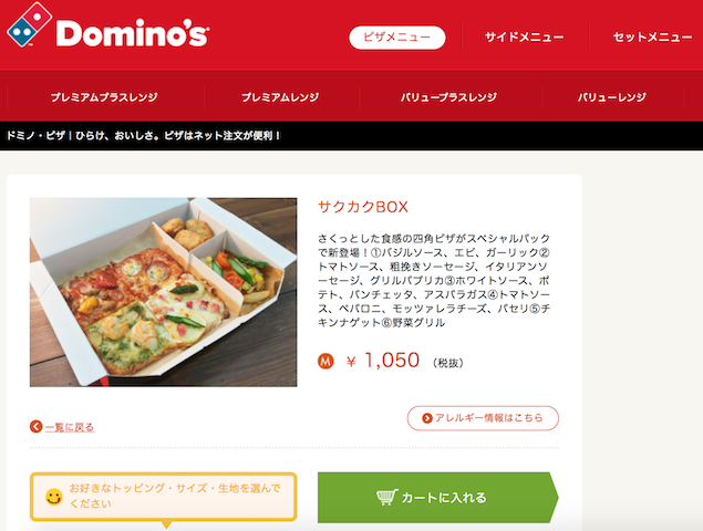 炎上マーケティング、エイプリルフール、LINEで注文を完結させたり様々なマーケティングを積極的に展開しているドミノ・ピザ(Domino’s Pizza)ですが、偶然ネット注文をする際にニーズ調査に遭遇しました。新商品が出たのかと思い、サクカクboxを選ぶと通常のフローと同じく商品ページに推移します。