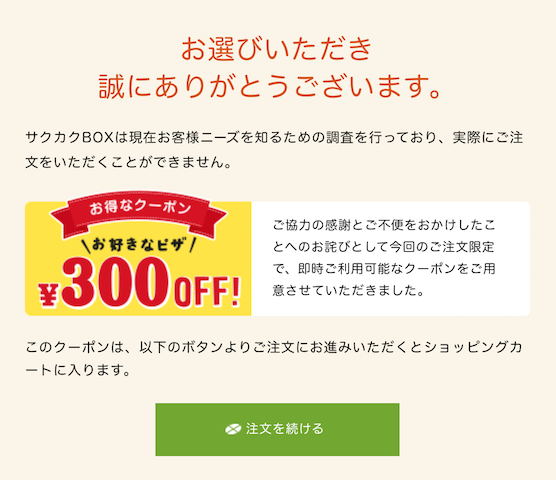 なんと!カートに入れようとするとニーズ調査協力のお詫びとお礼クーポンが表示。市場調査などサービス立ち上げ前もしくは立ち上げ後の初期フェーズなどでは重要になると思いますが、一定のユーザー数が出た場合、既存ユーザーに聞くのが一番効果的なのは理解してますがこれをキレイに実行しているドミノ・ピザには驚き思わずスクリーンショットを撮ってしまいました!笑 このようなマーケティング思考はとても素敵だと思います。