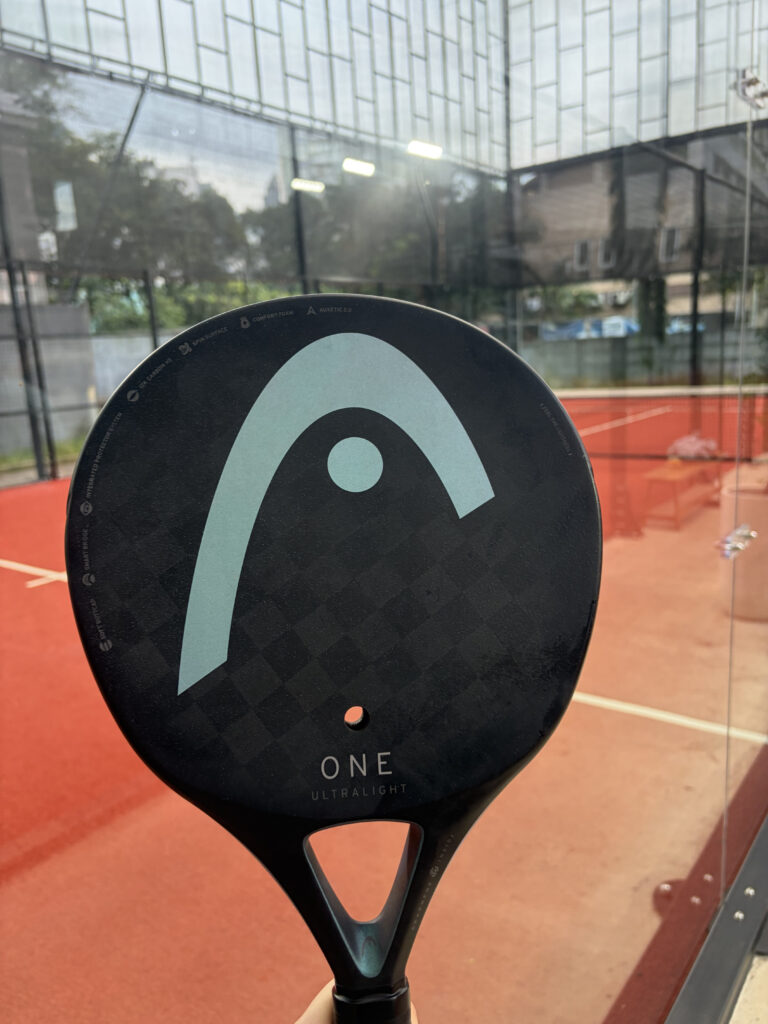 パデルを初めて見た人が必ず驚くのが、このラケットだ。ストリング(ガット)がない。パデルのラケット(「パラ / pala」と呼ぶ)はカーボンファイバーやグラスファイバーでできた固体のパドルで、面には小さな穴が無数に空いている。この穴が空気抵抗を減らし、スピンのコントロールを助ける。卓球のラケットに近い構造とも言えるが、弾力のあるサーフェスとコントロール感覚はまた別物だ。今回使ったHeadのOne Ultra Lightは軽くて振り抜きやすく、初心者にも扱いやすかった。