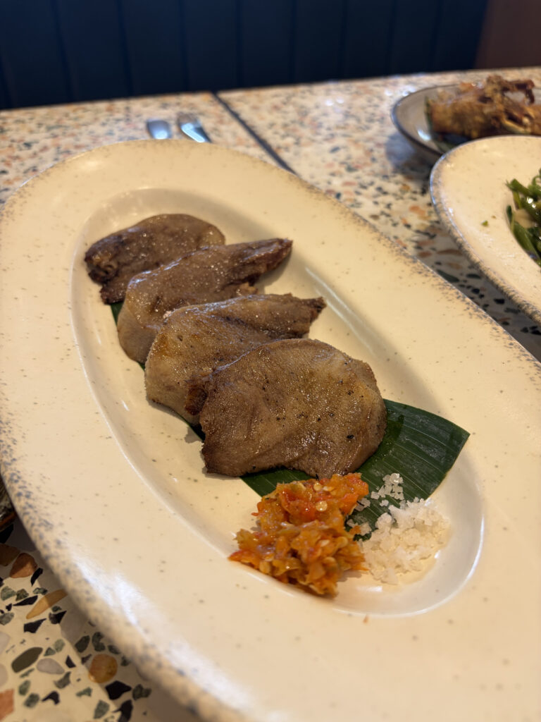 牛タンは、東京で大好物として食べているそれとはスタイルと少し違う。Putumadeの牛タンは厚切りで、バナナの葉の上に重なるように盛りつけられてくる。添えられているのは粗塩と、赤く鮮やかなサンバル。このサンバルが絶品で、ジャカルタのスパイスの熱がタンの旨味をぐっと引き出す。東京の牛タンとどちらが好きかと聞かれると、答えに困る。それぞれに別の良さがあって、比べるものではない。ただ確かなのは、このお皿が来るたびに「ジャカルタに来てよかった」と思うということだ。
