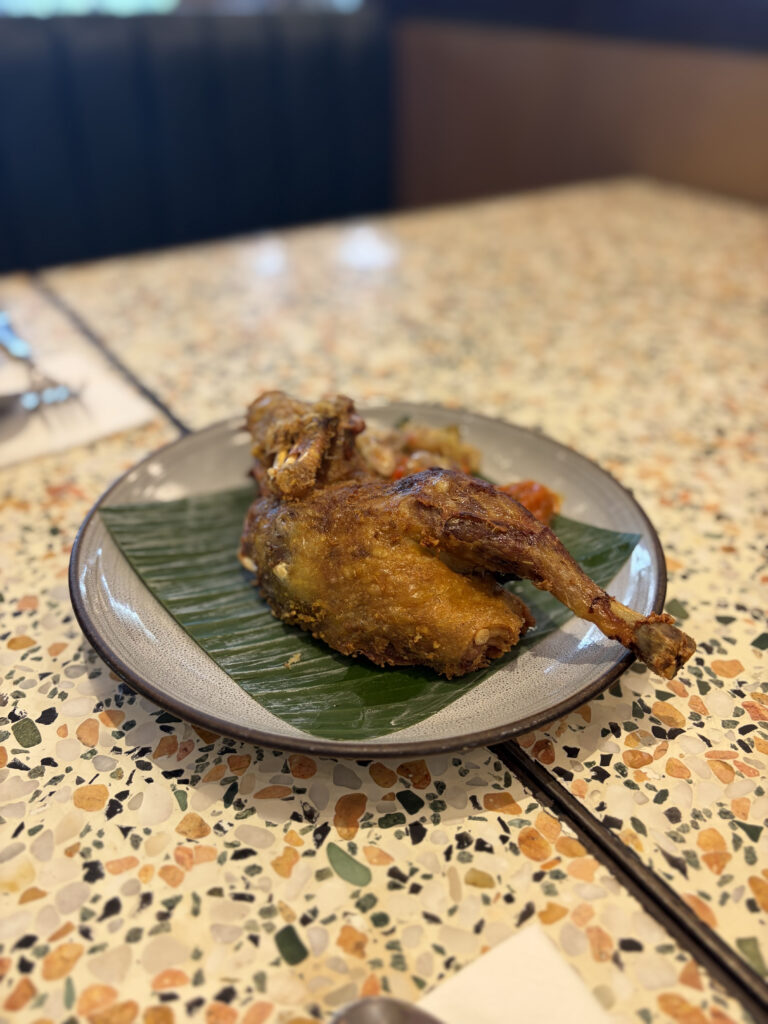 そしてクリスピーダック。黄金色に輝く衣をまとった一羽が、バナナの葉の上にどかんと置かれてくる。箸を入れた瞬間に響く、あのパリという音。外側はまるでキャラメリゼしたかのような薄い飴層のような食感で、中は驚くほどしっとりと柔らかい。アヒルの脂の甘みが口の中でゆっくりと広がり、添えられたサンバルの辛みがその余韻を締めてくれる。パデルで全身を使って動かした後の空腹の胃に、これほど報われる一皿がある。消費したカロリーを軽く超えて取り戻したことは言うまでもないが、このダックに関してはカロリー計算を完全に放棄した。食べ終えた後、しばらくテーブルに沈黙が生まれるほど、みんなが満足していた。